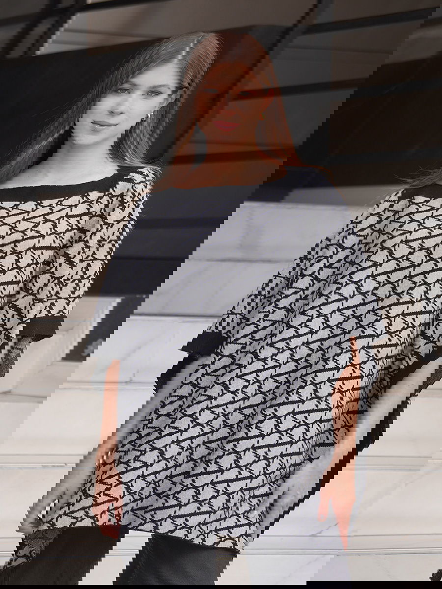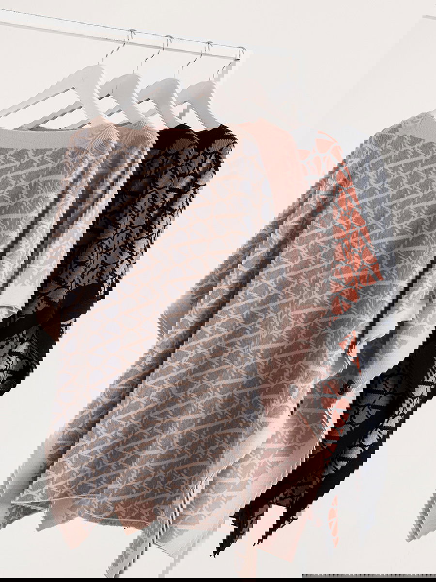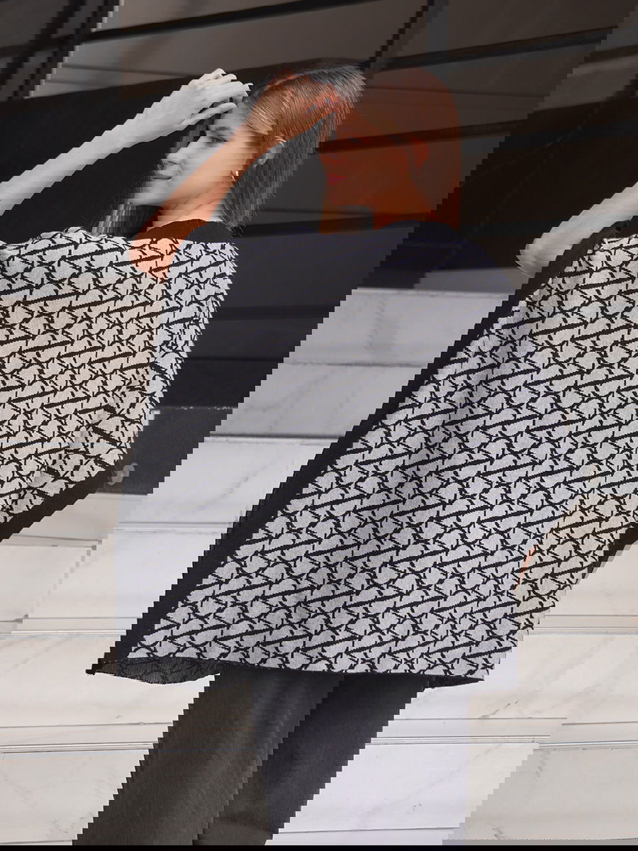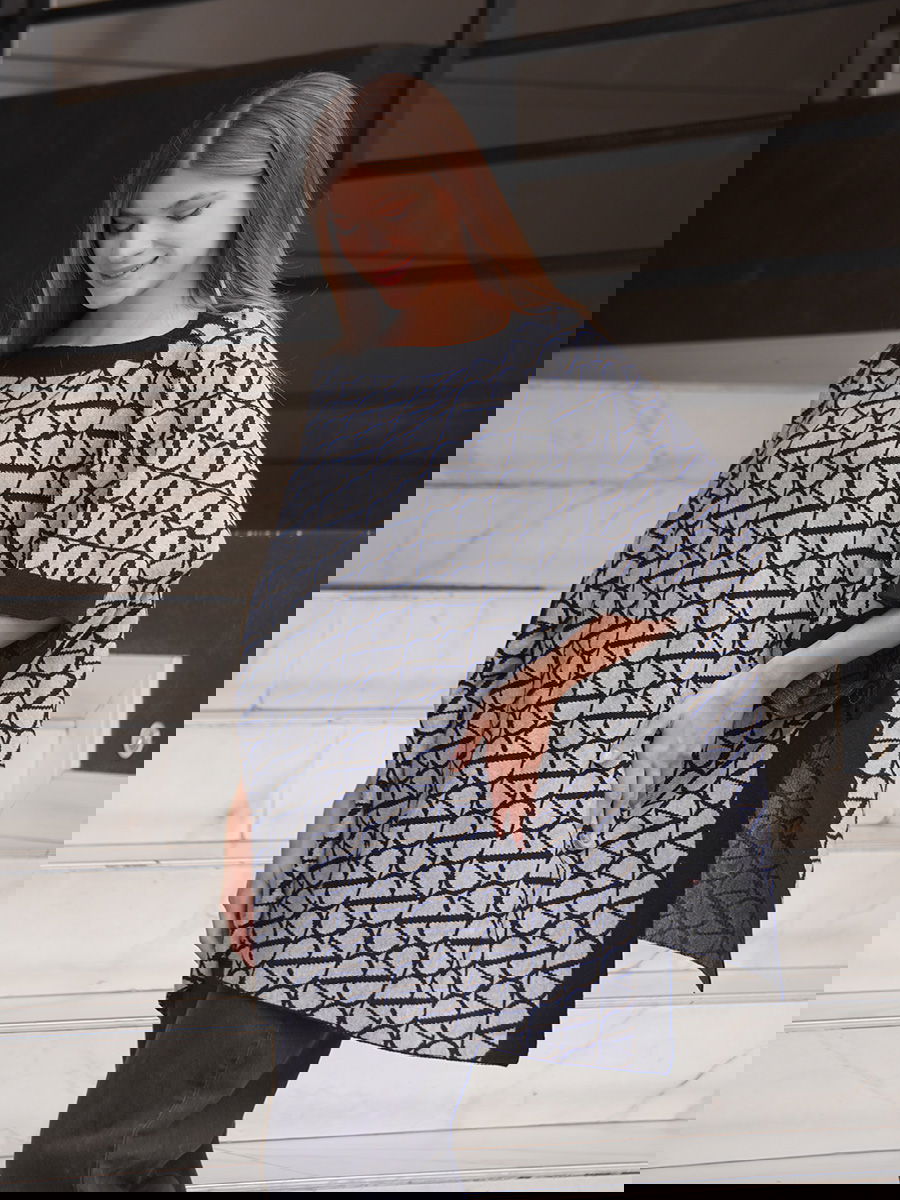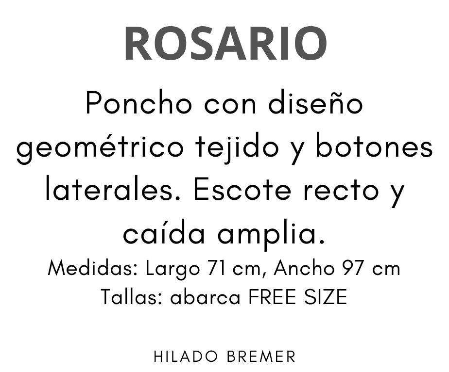 Poncho con diseño geométrico tejido y botones laterales. Escote recto y caída amplia.