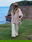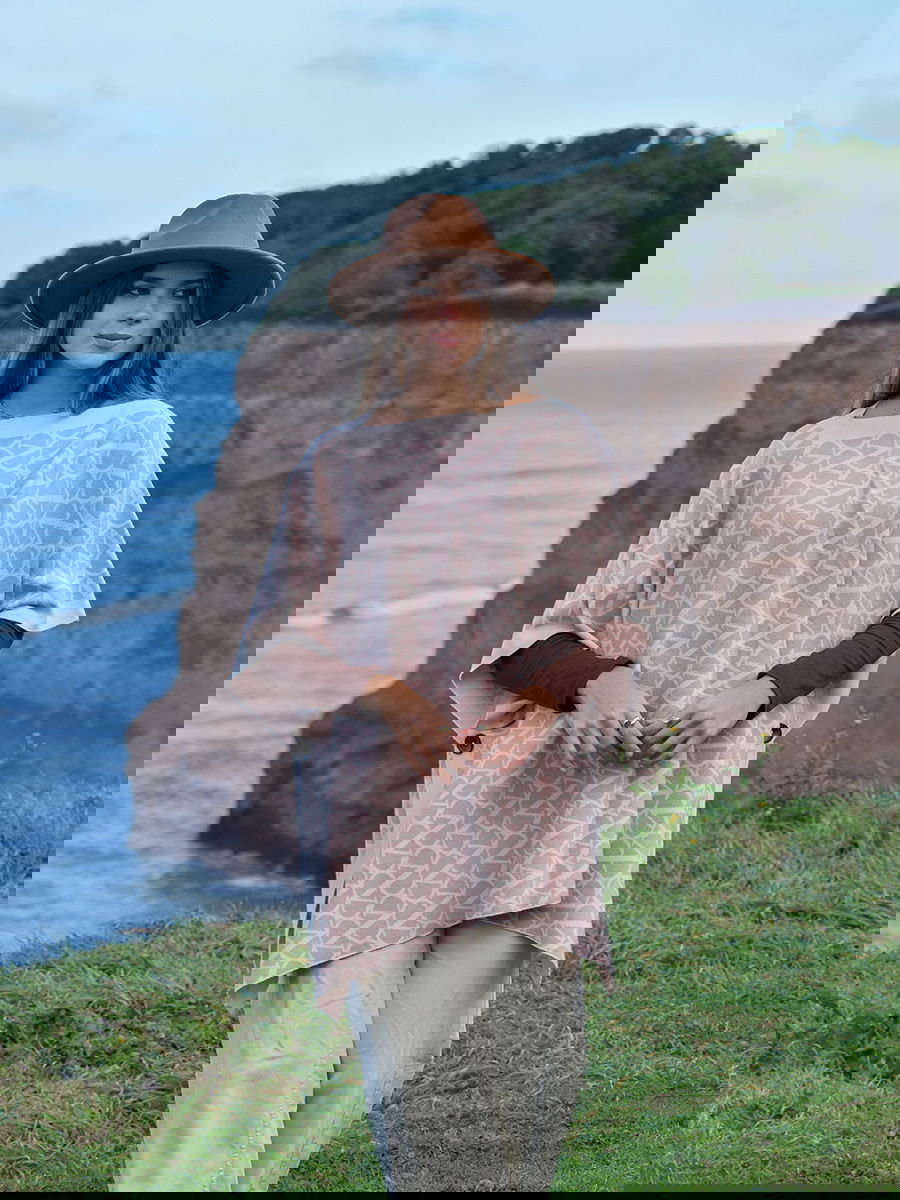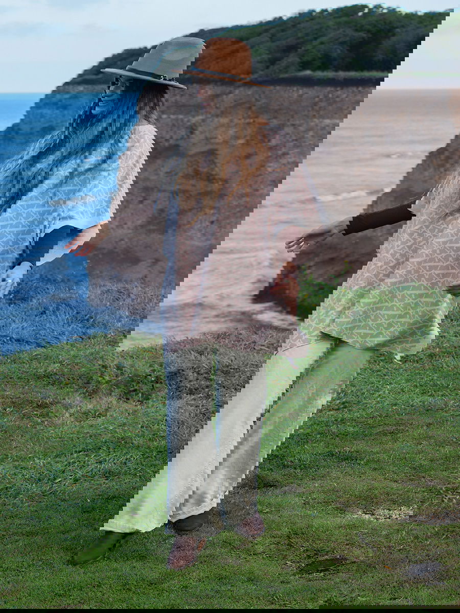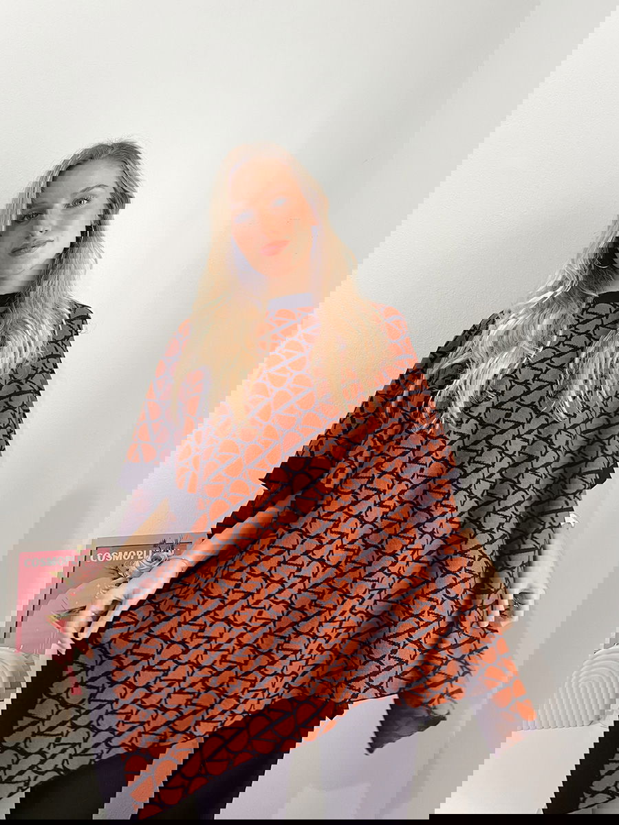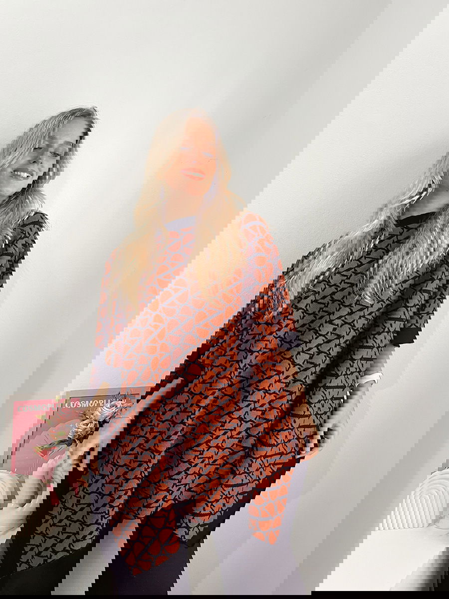 Poncho con diseño geométrico tejido y botones laterales. Escote recto y caída amplia.
