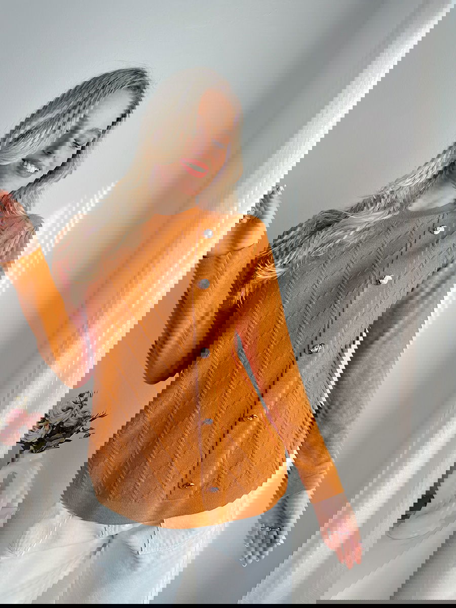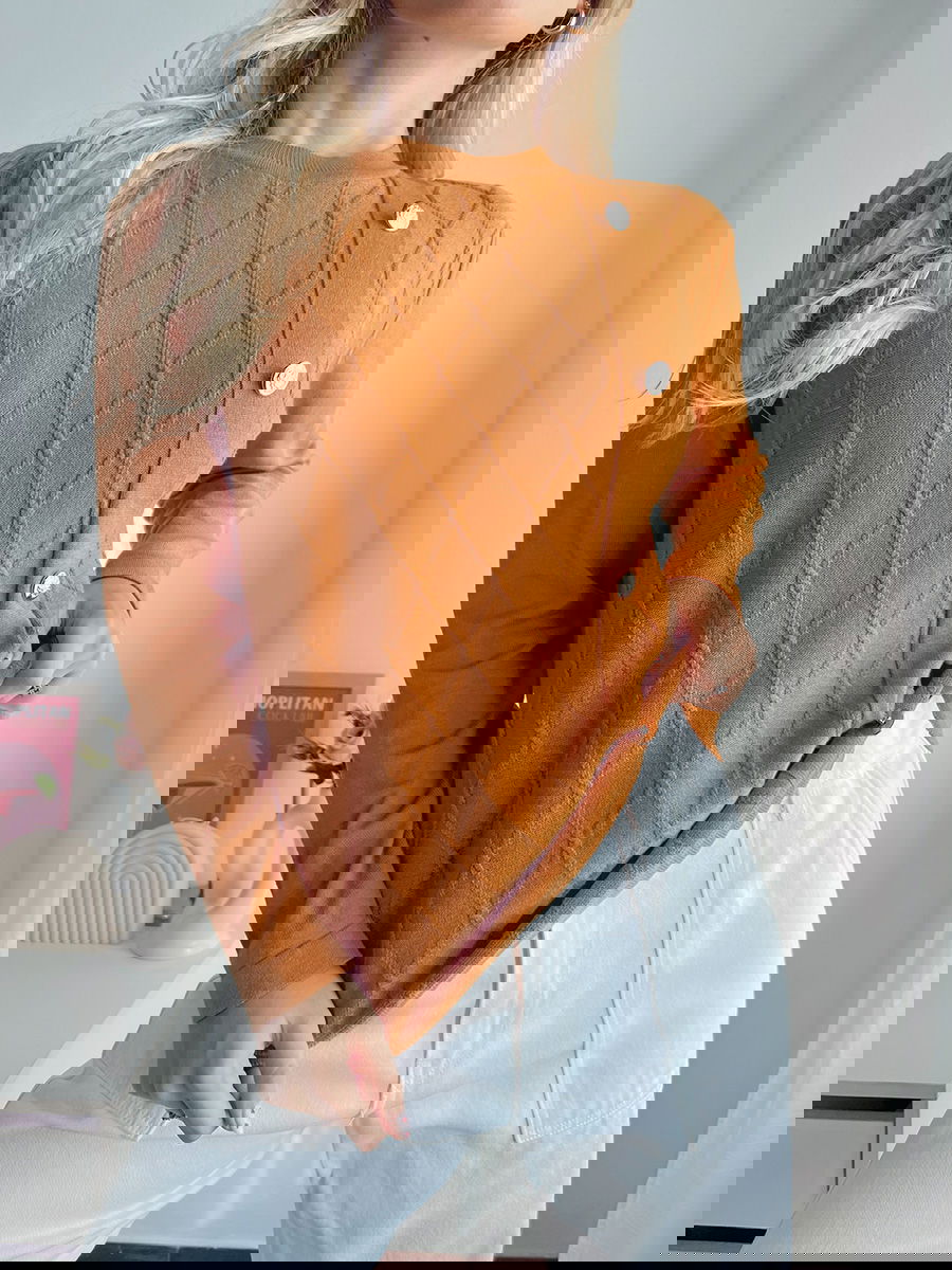 Suéter con trama de rombos en el frente y cartera lateral con botones metálicos.