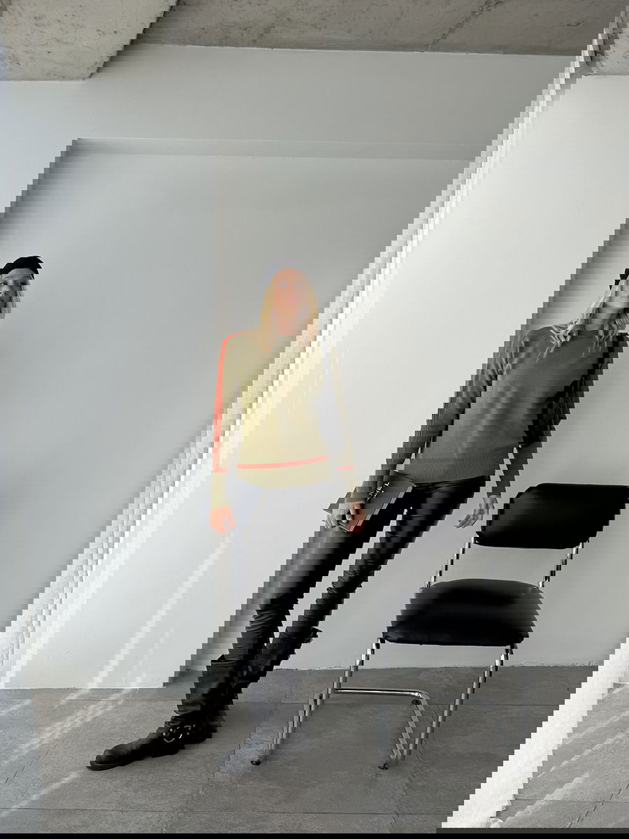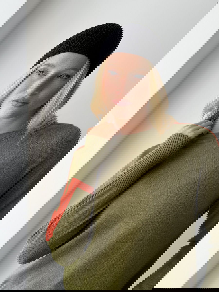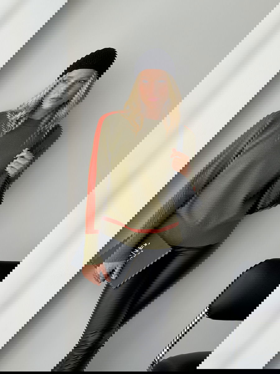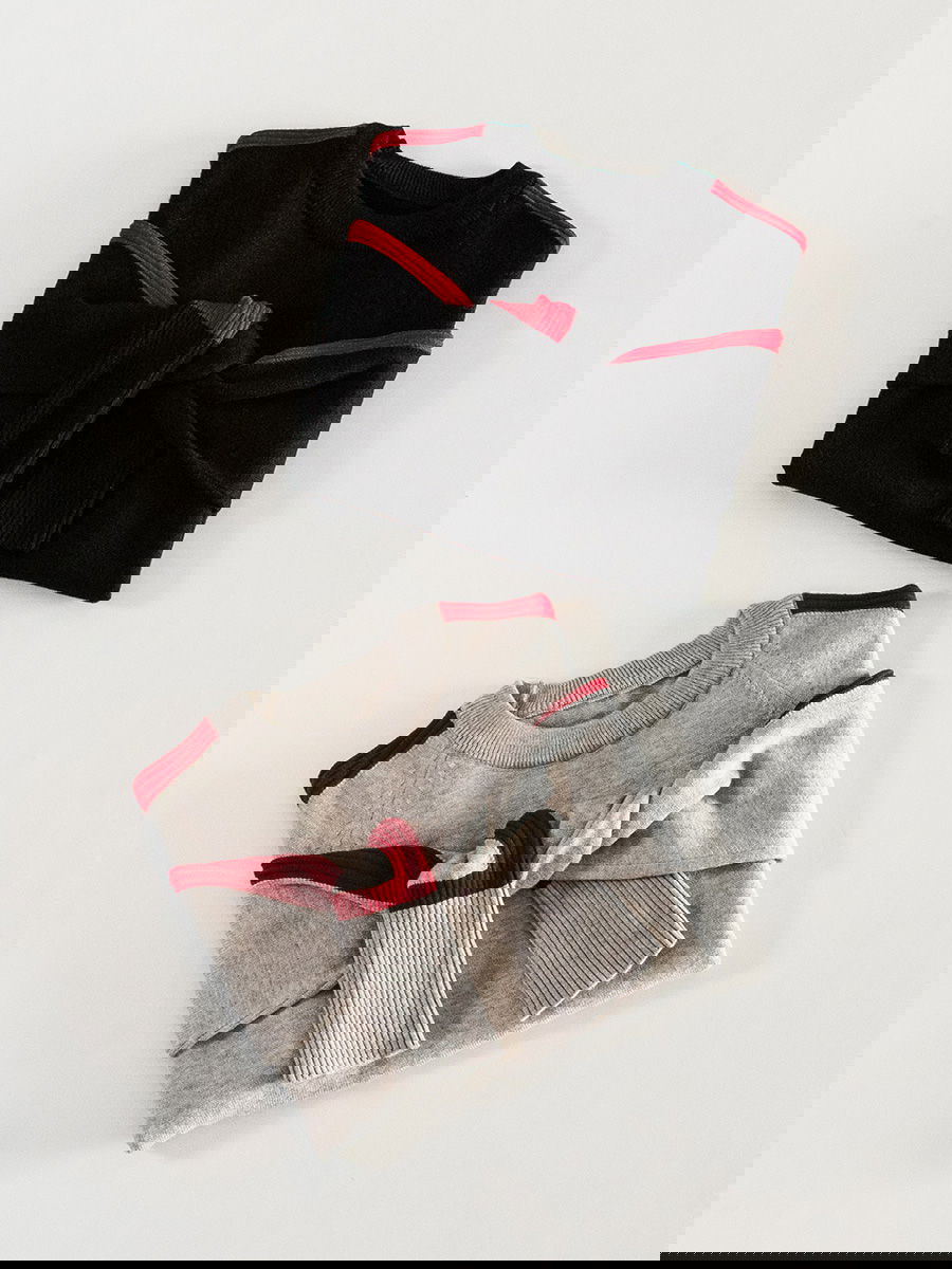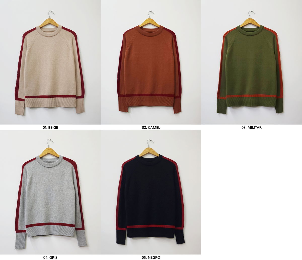 Sweater de punto con frente liso y detalle combinado en mangas mediante franjas laterales.