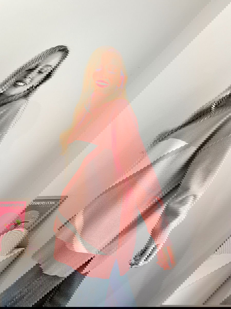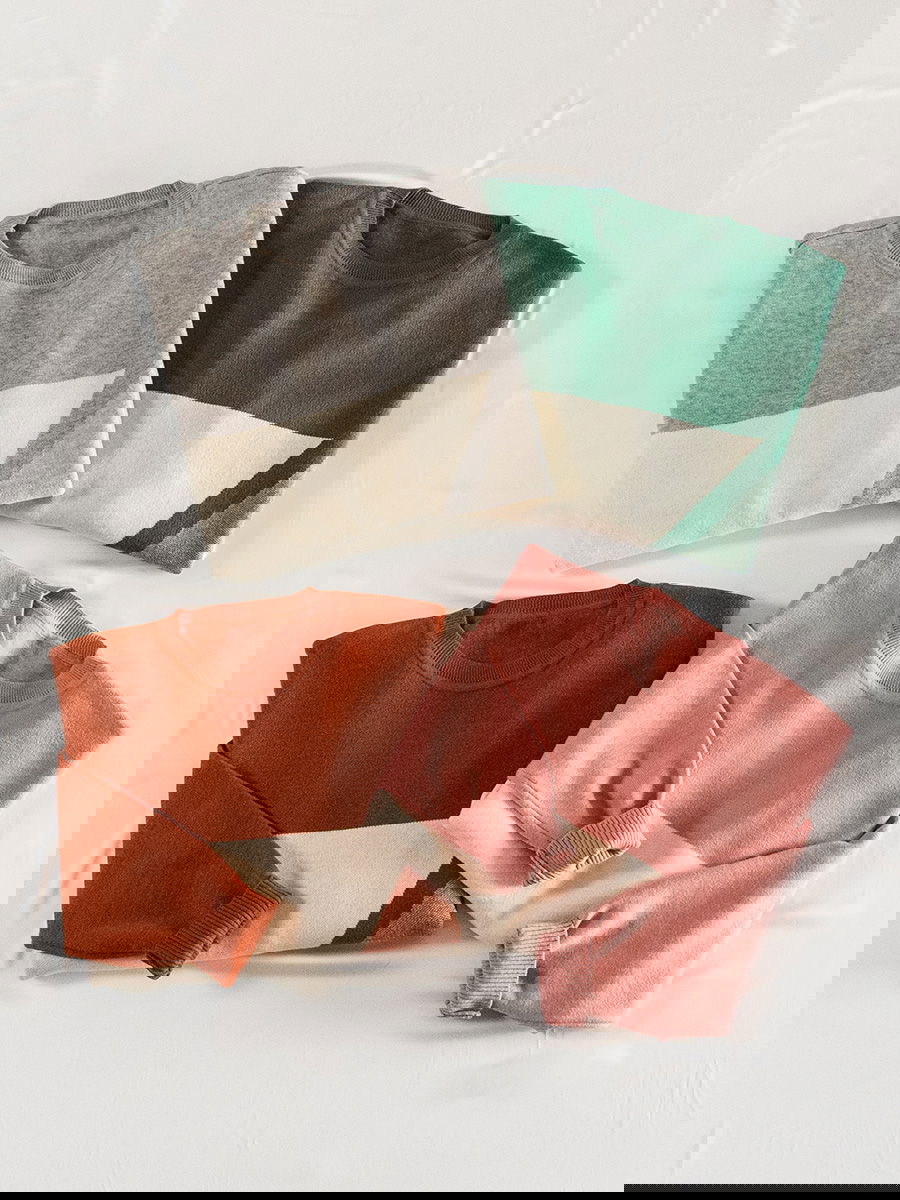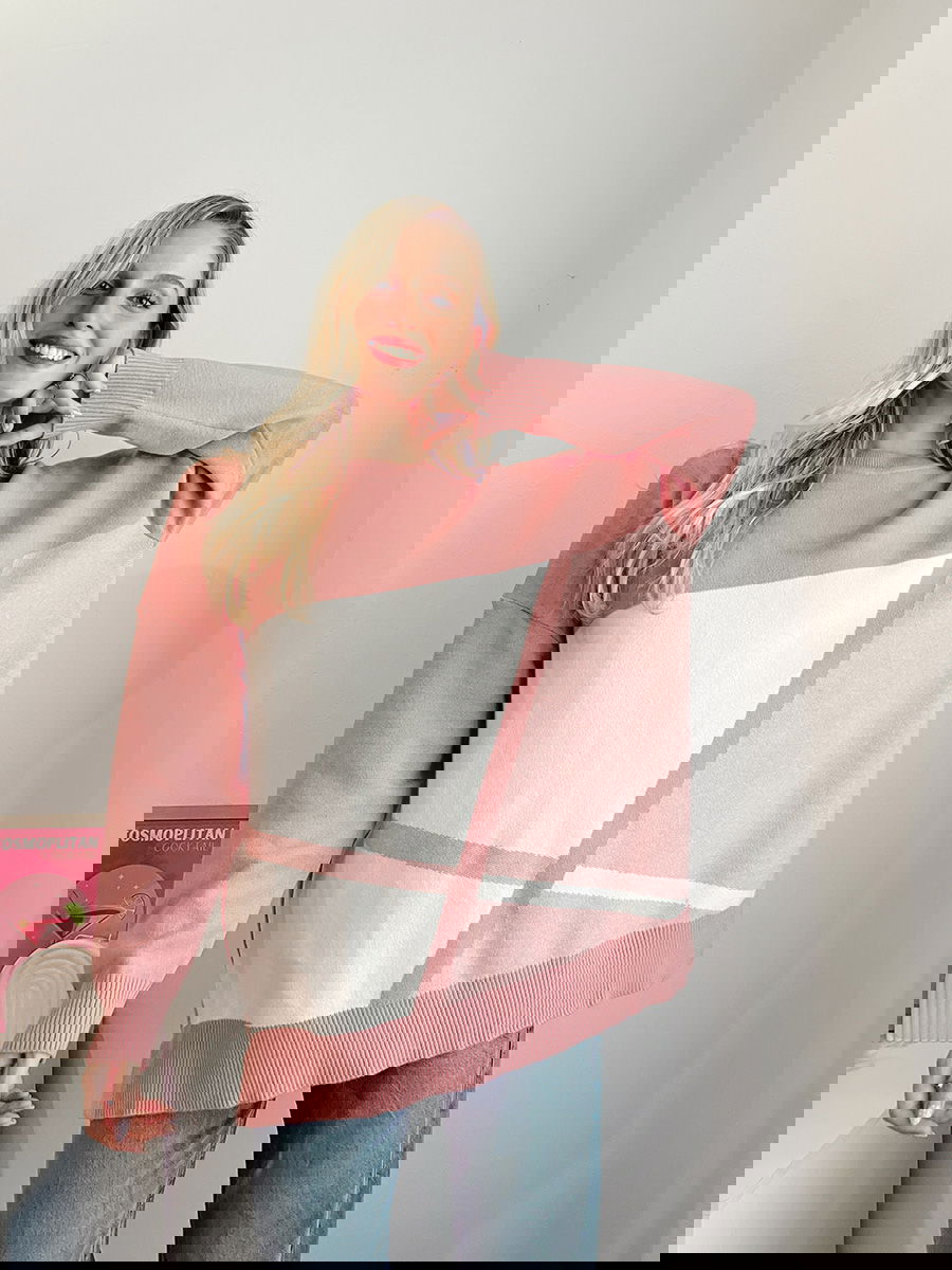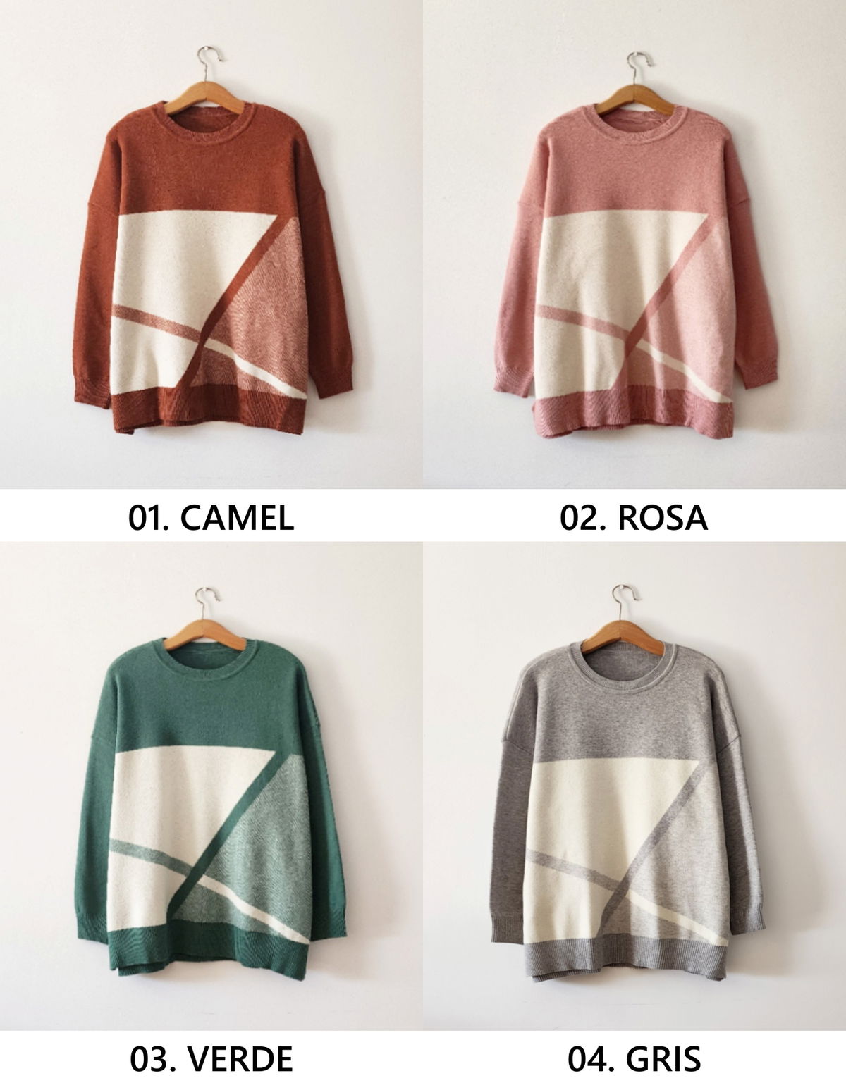 Sweater con diseño geométrico frontal en bloques y líneas diagonales.
