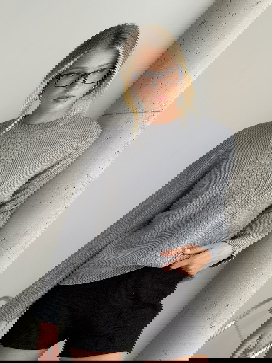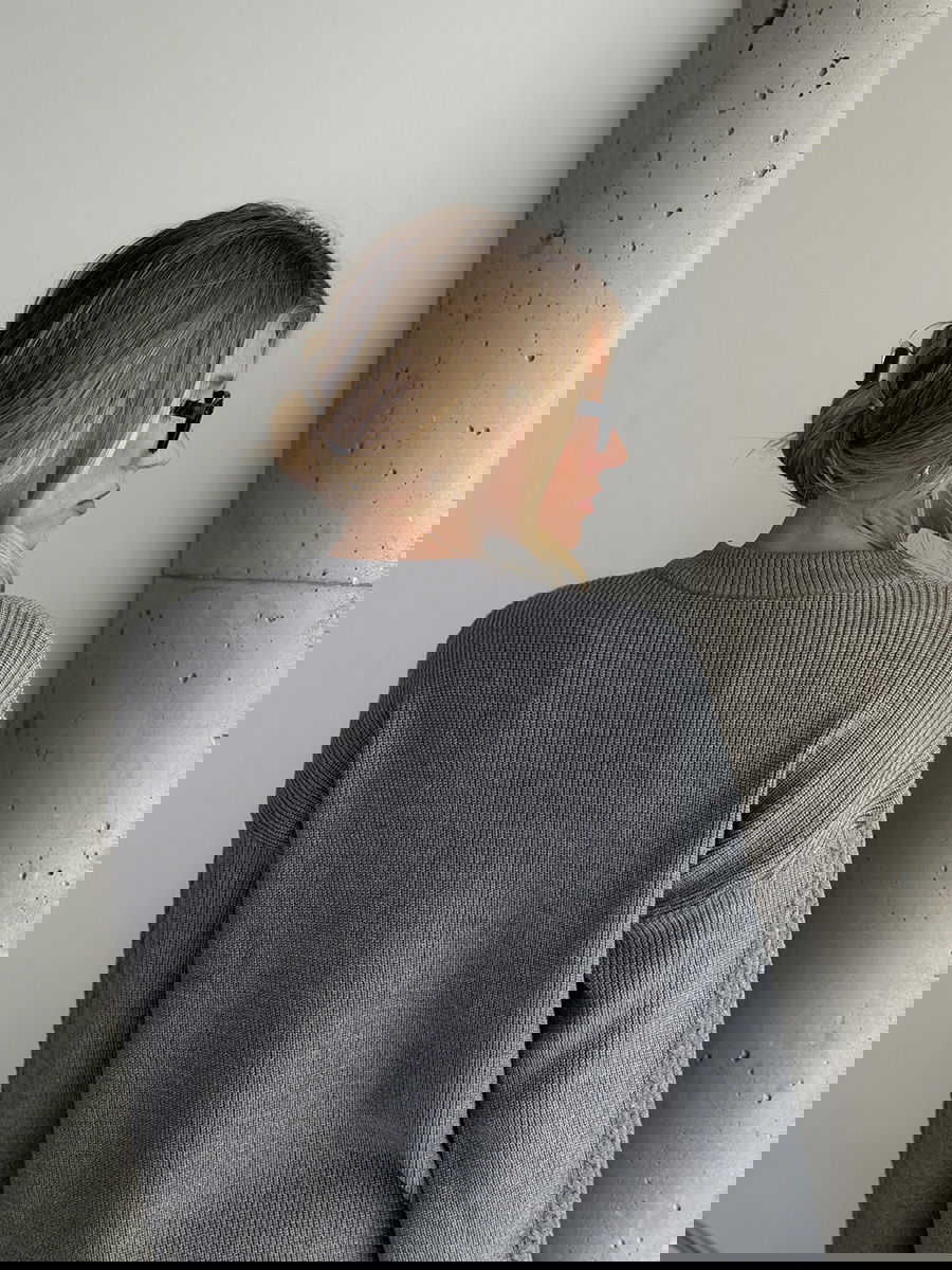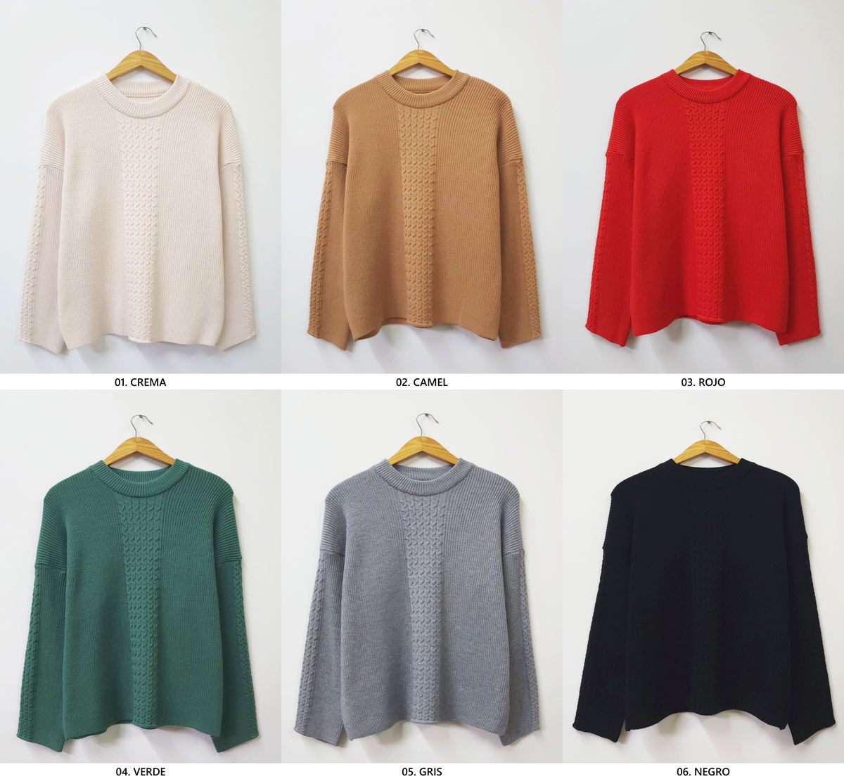 Sweater tejido de punto con trama combinada. Frente con panel central de diseño trenzado y laterales lisos.