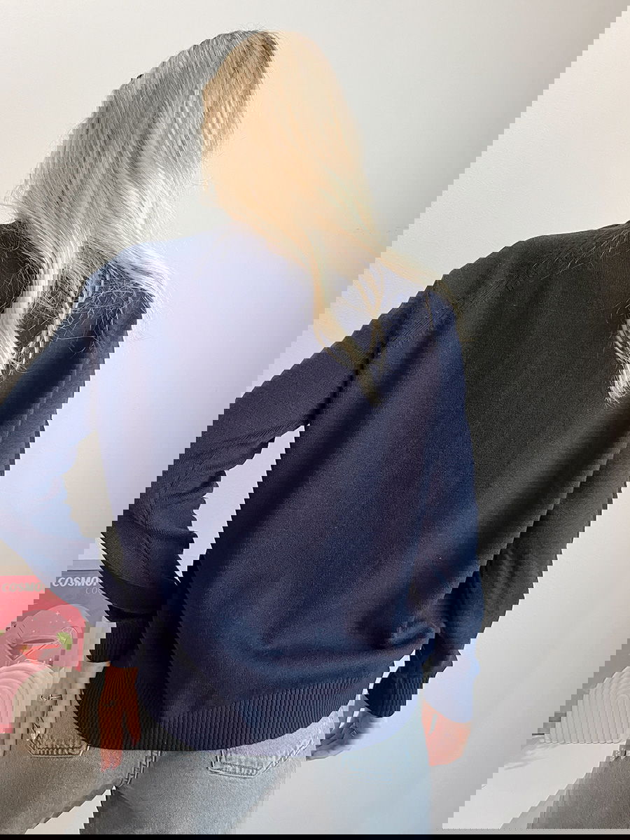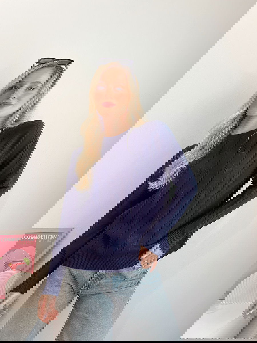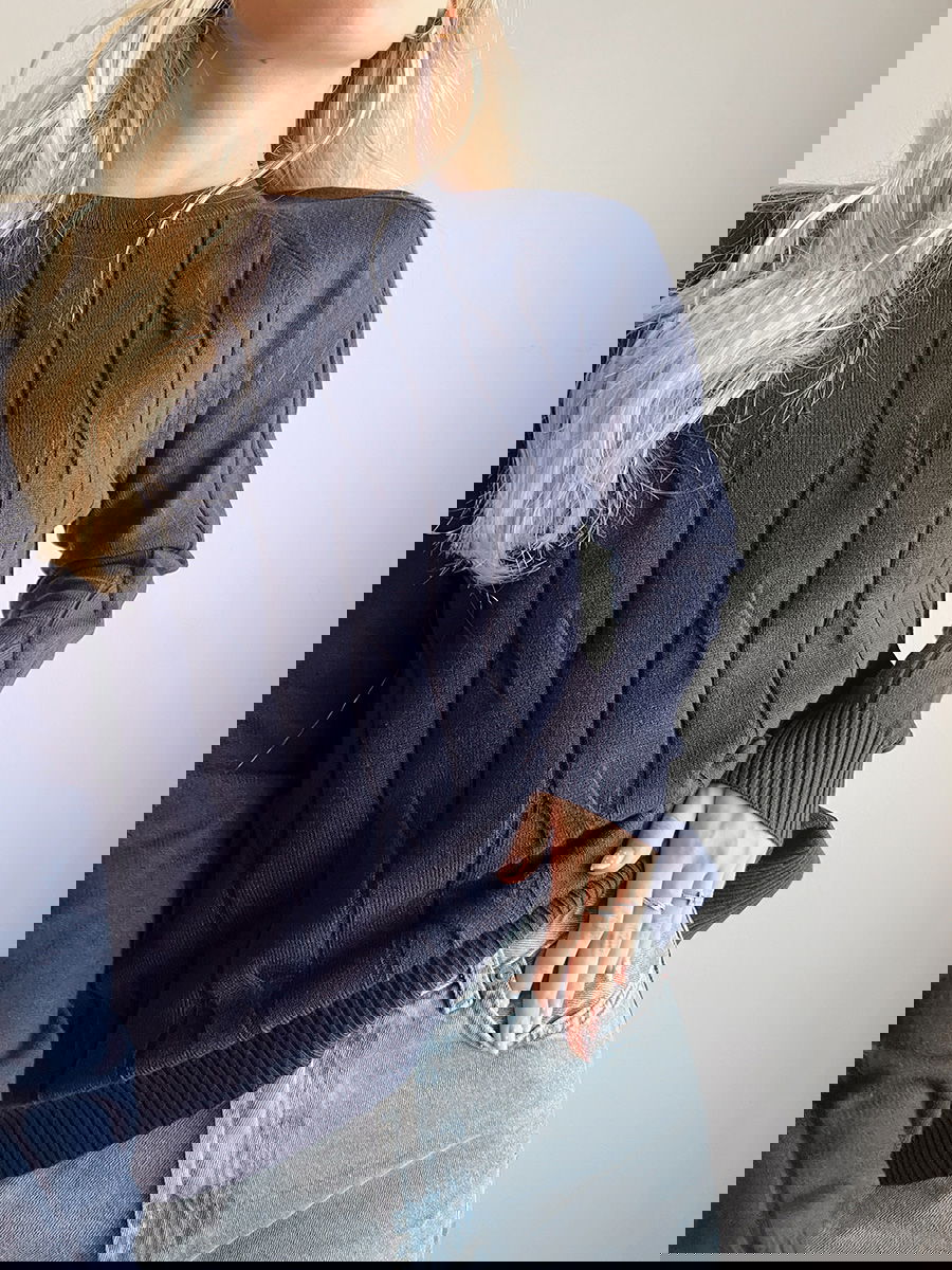 Sweater de punto con diseño de trenzas verticales en el frente.