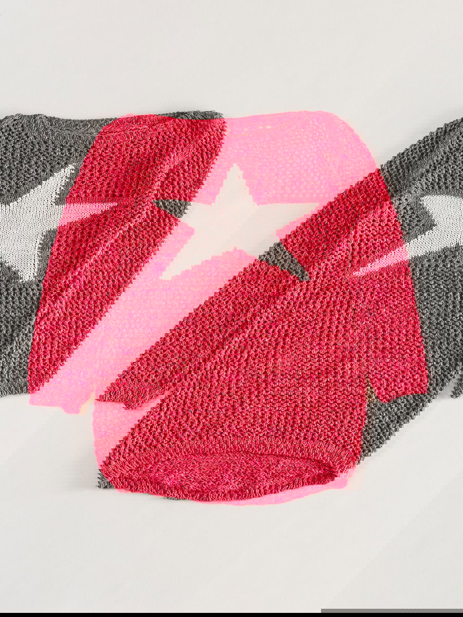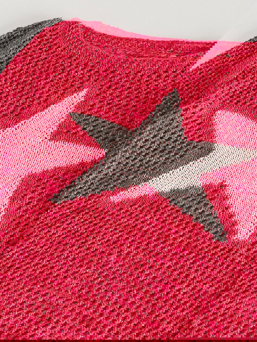 Sweater tejido liviano con diseño calado en todo el cuerpo y mangas. Motivo de estrella tejido en el frente. Terminaciones acanaladas en cuello, puños y ruedo.