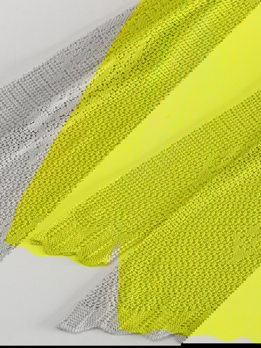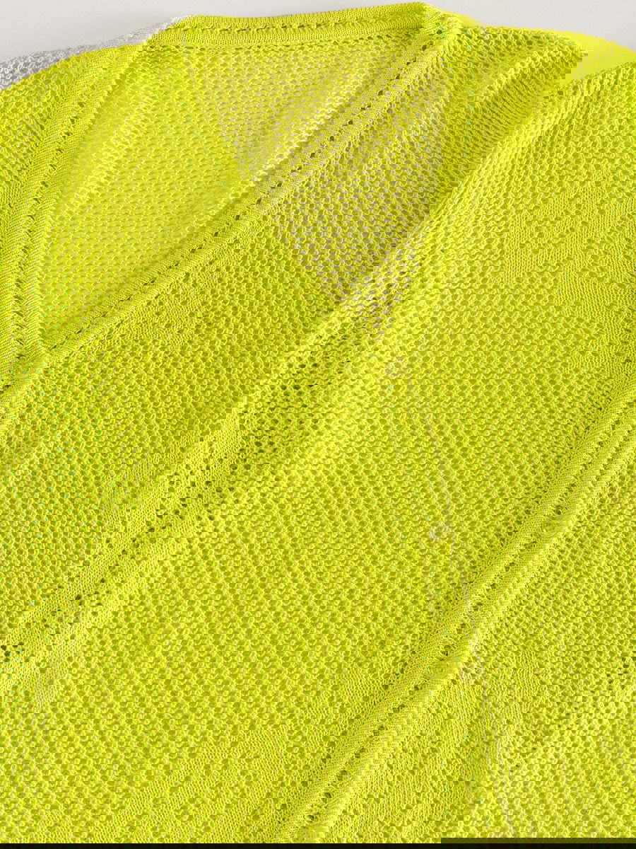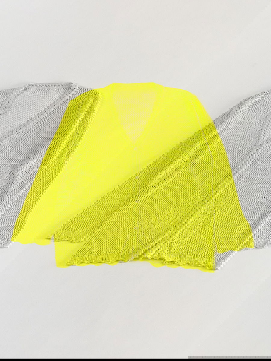 Saco tejido liviano con diseño calado en todo el cuerpo y las mangas. Escote en V y cierre delantero con botones. Terminaciones acanaladas con borde ondulado en puños y ruedo.