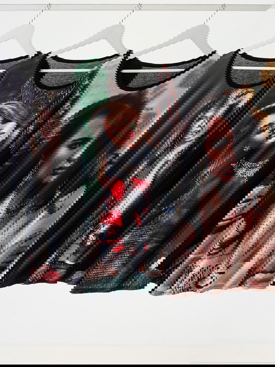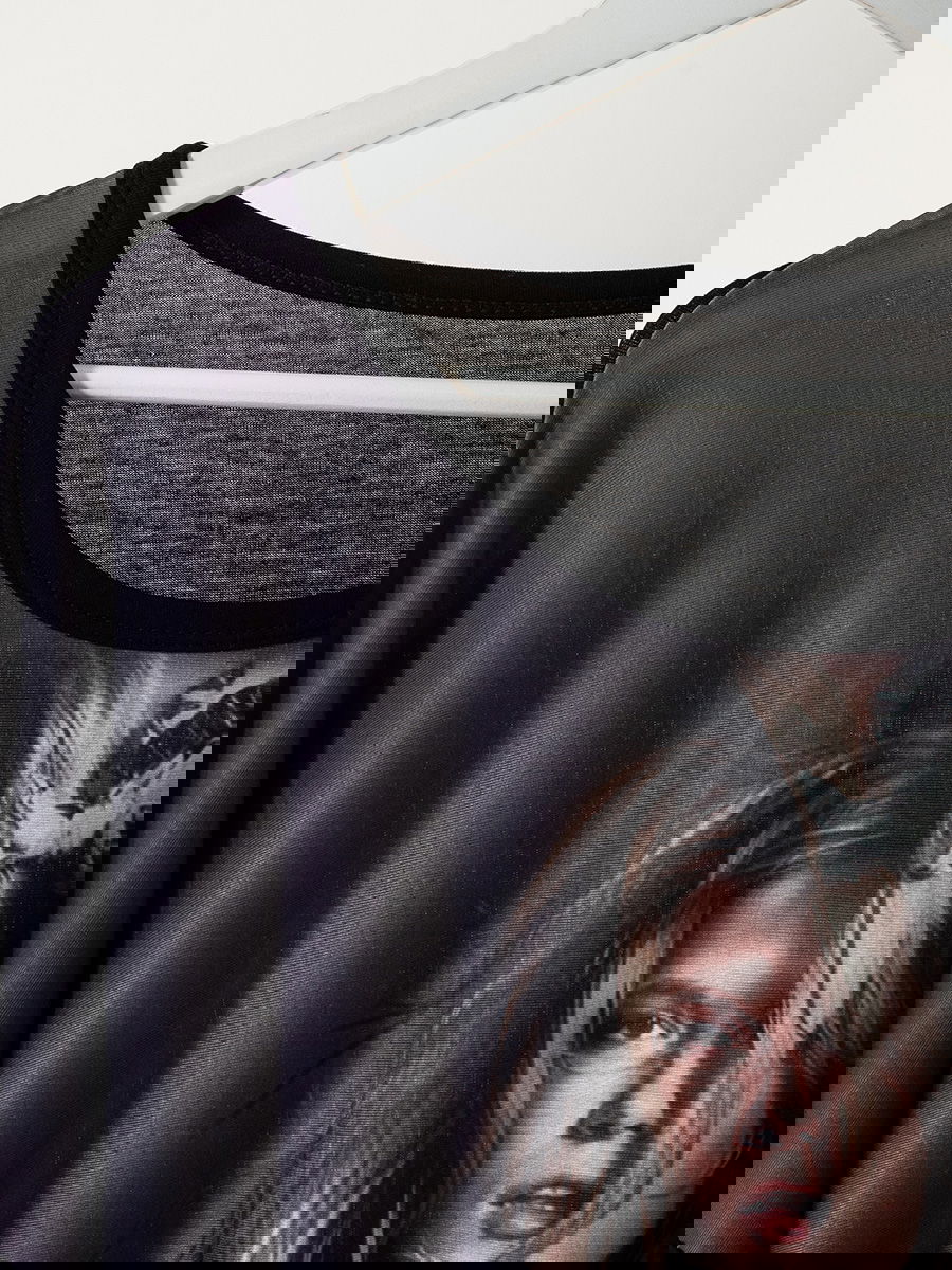 Remera manga larga con frente estampado tipo gráfica fotográfica. Cuello redondo y contornos en rib negro. Espalda y mangas en tejido liso a contratono.