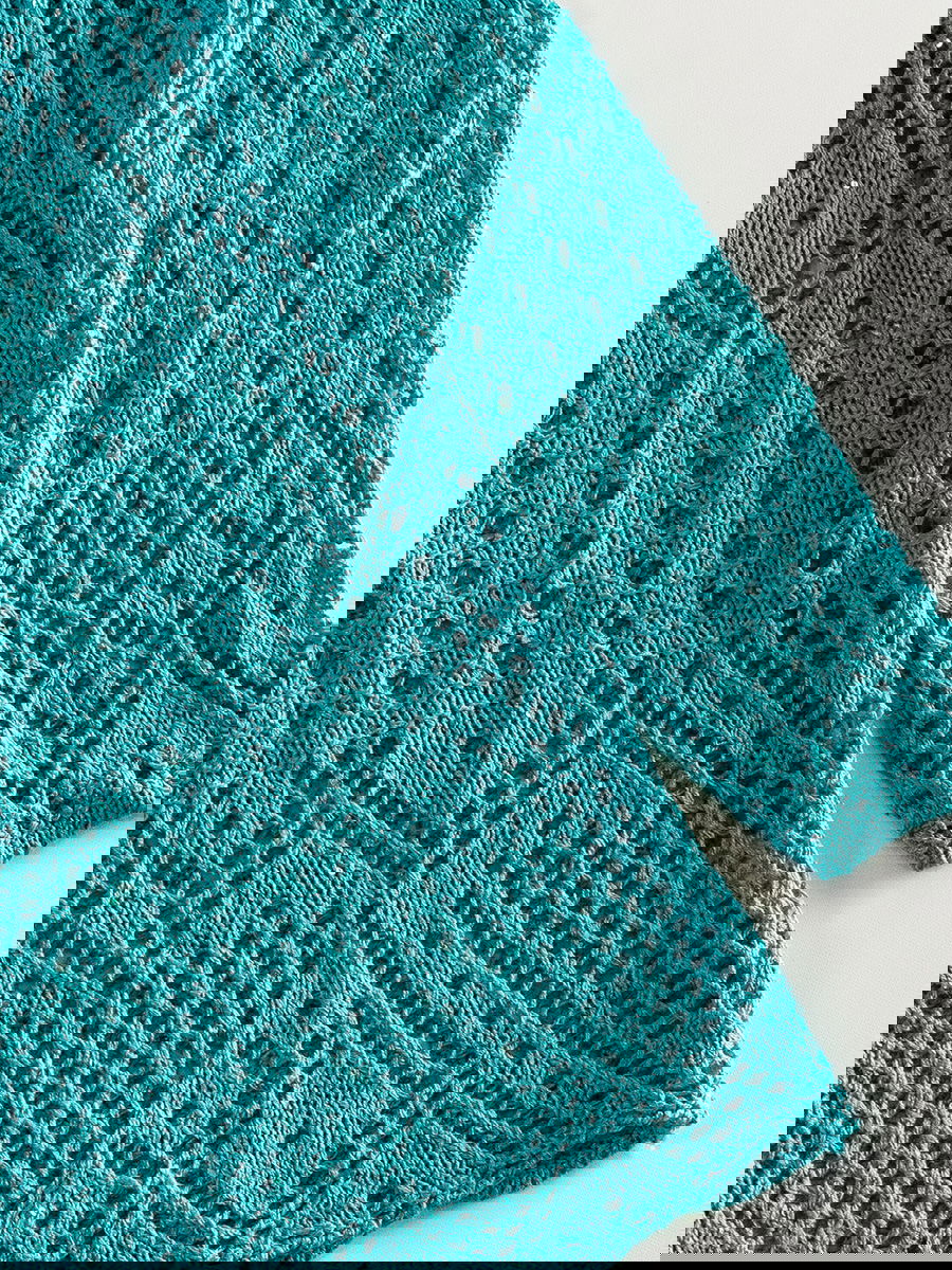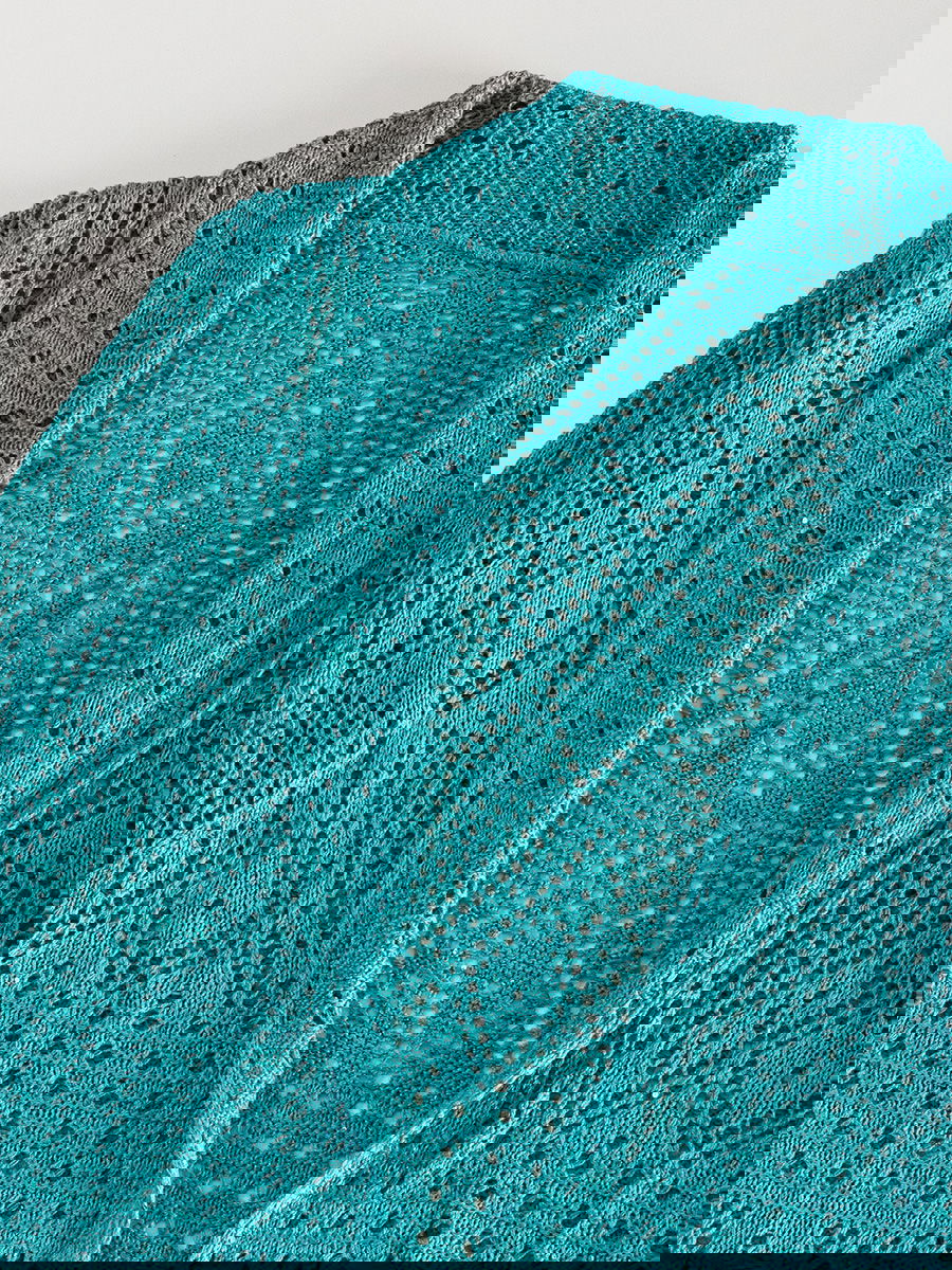 Saco tejido liviano con diseño calado geométrico en todo el cuerpo y mangas. Frente abierto sin cierre, con borde tejido en punto más compacto. Terminación recta en ruedo y mangas.