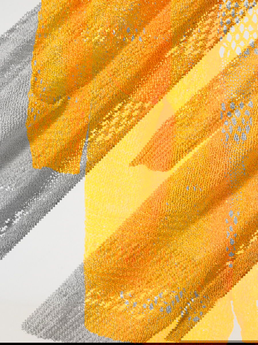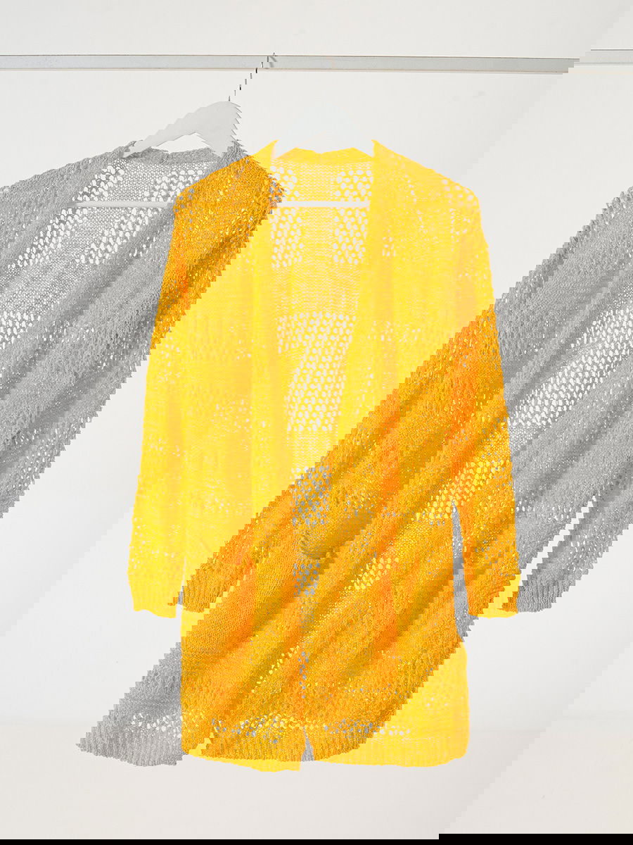 Saco tejido largo con combinación de puntos calados y trama cerrada en franjas. Frente abierto sin cierre, mangas largas con puño acanalado y bolsillos aplicados en el delantero. Terminación recta.