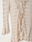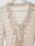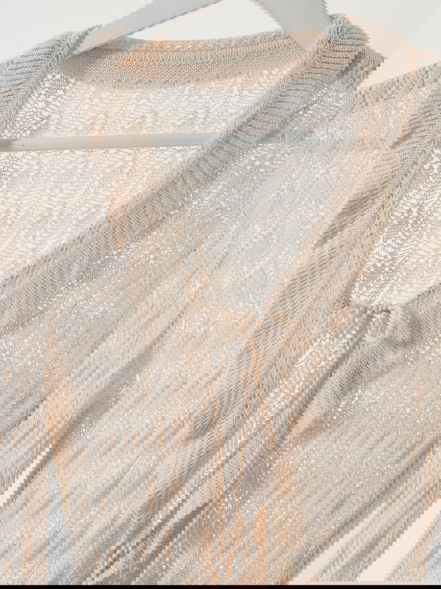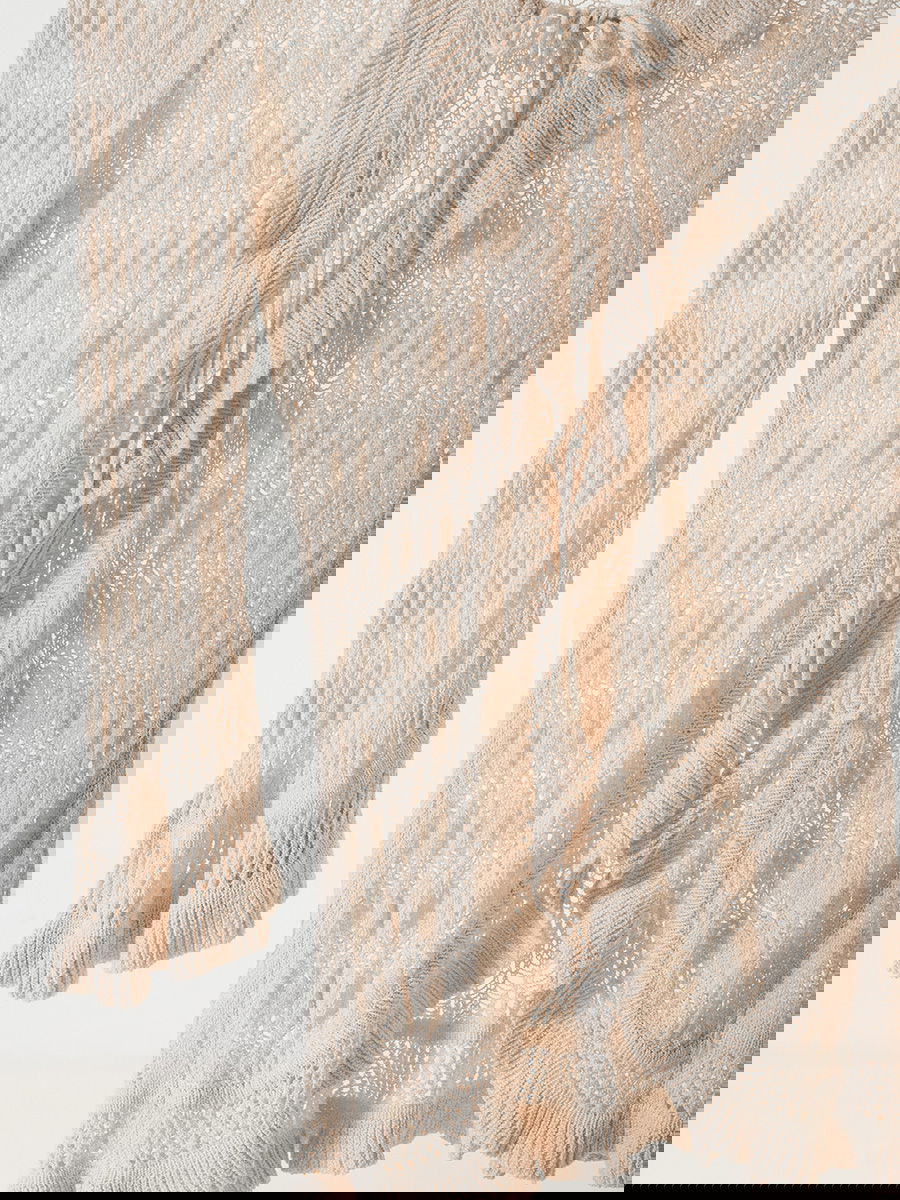 Saco tejido liviano con calado en todo el cuerpo. Escote en V con borde acanalado y pequeño volado en el frente. Cierre delantero con cordones tejidos. Mangas largas con terminación acampanada y puños calados. Bajo con volados y remate acanalado.