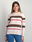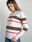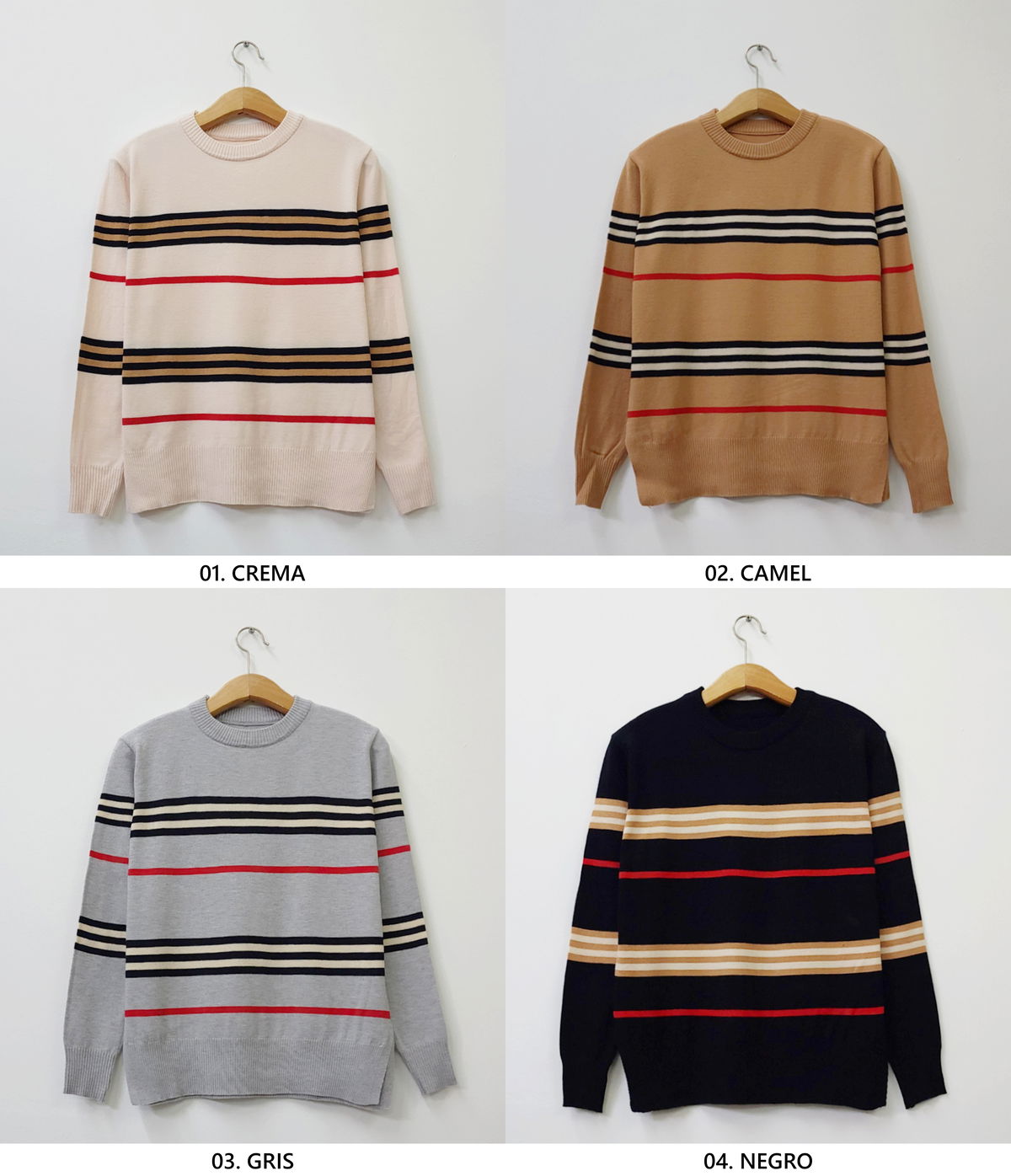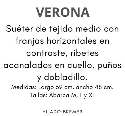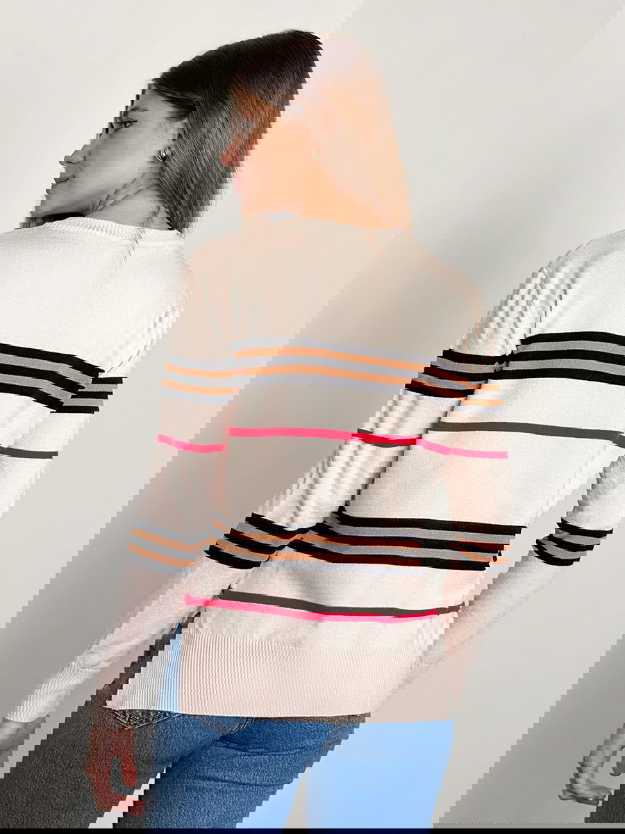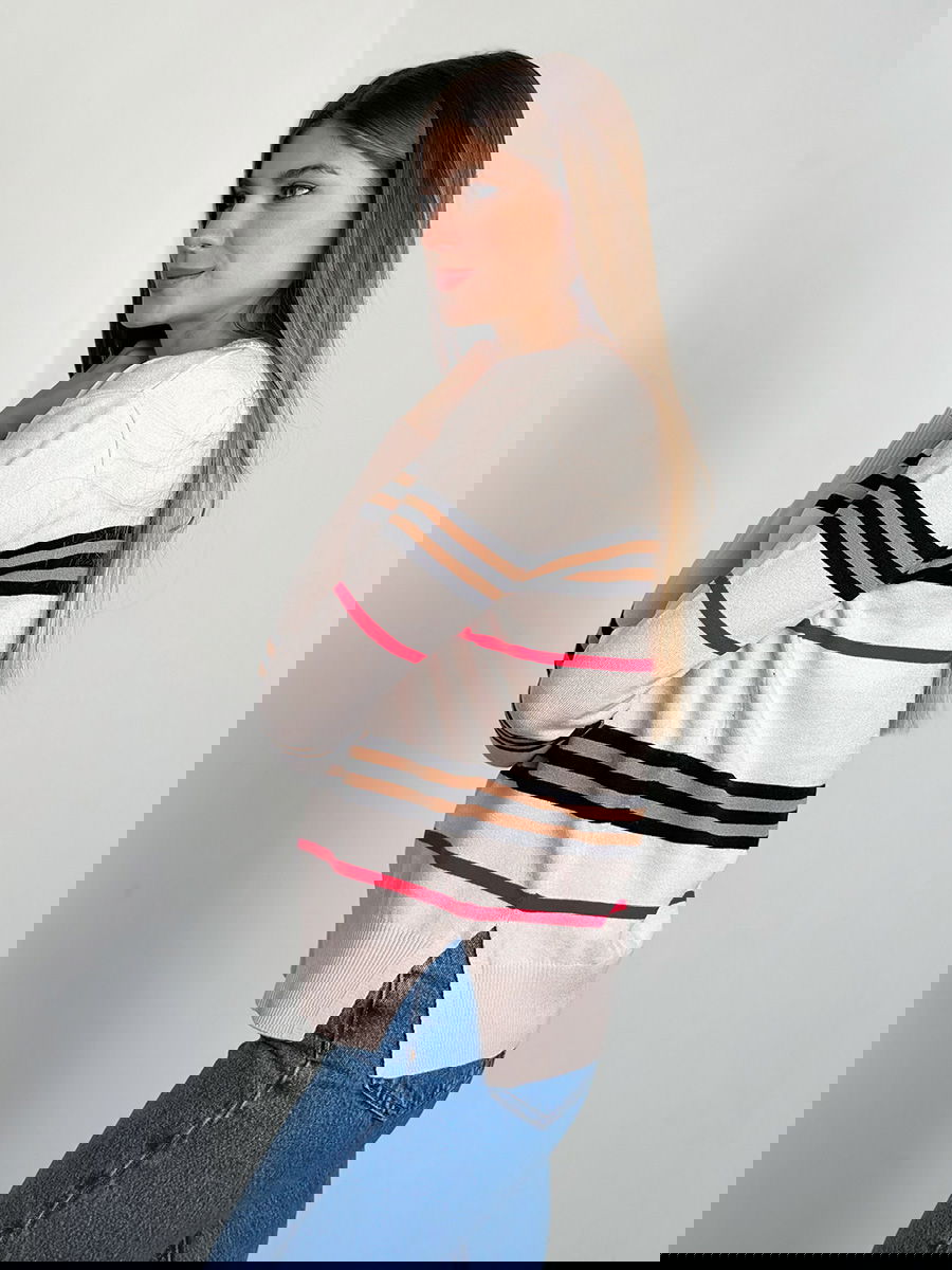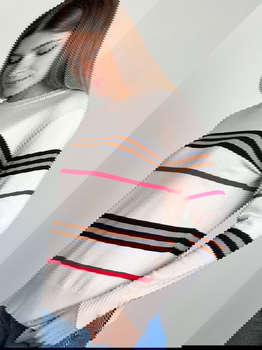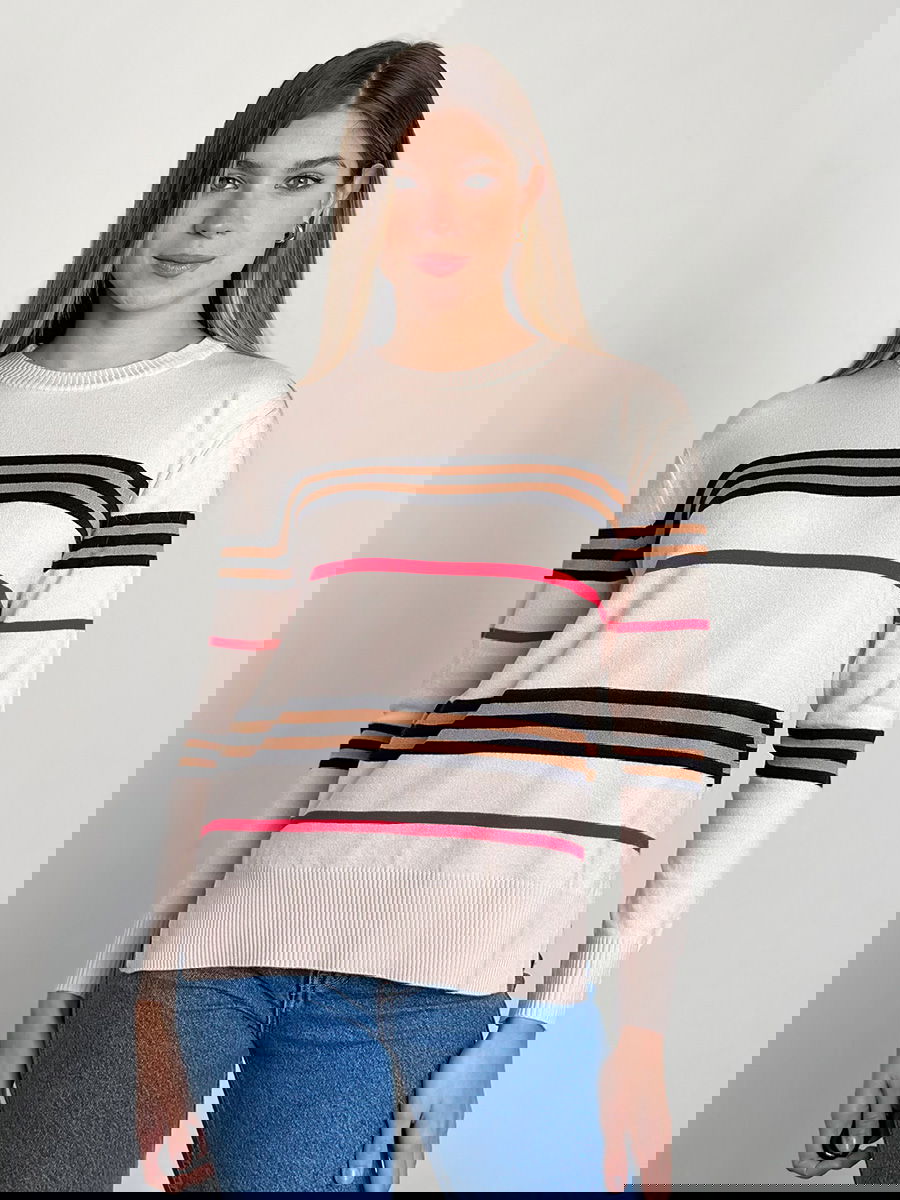 Suéter de tejido medio con franjas horizontales en contraste, ribetes acanalados en cuello, puños y dobladillo.