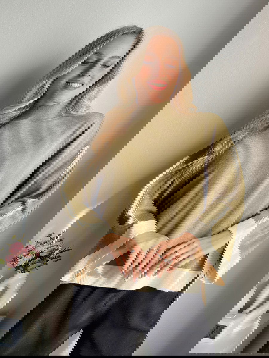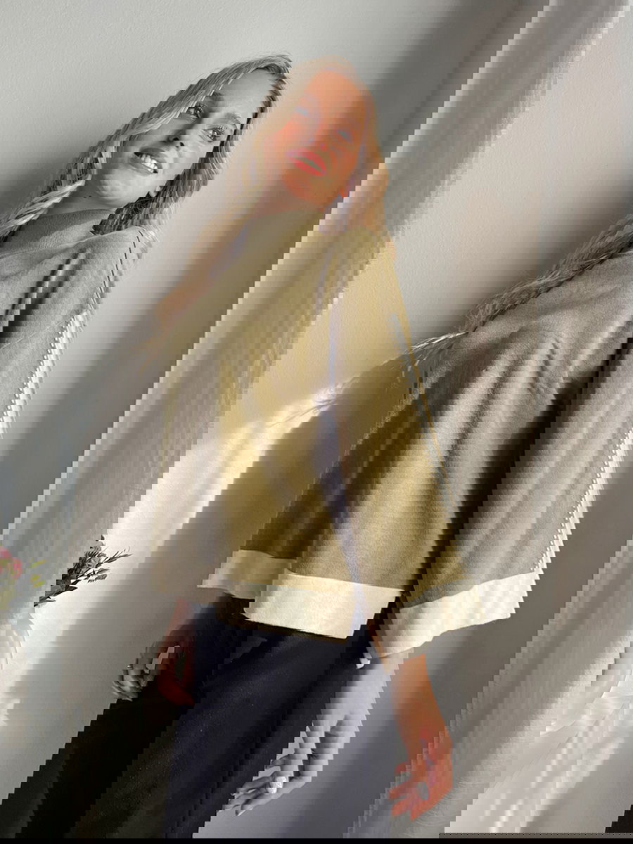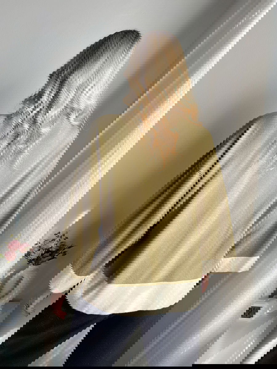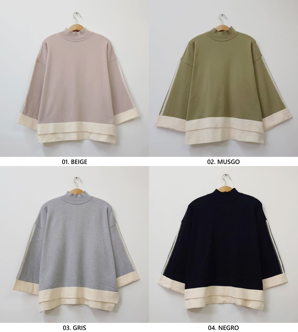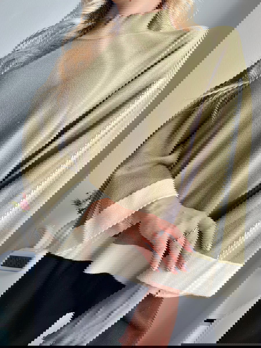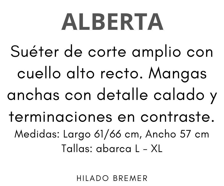 Suéter de corte amplio con cuello alto recto. Mangas anchas con detalle calado y terminaciones en contraste.