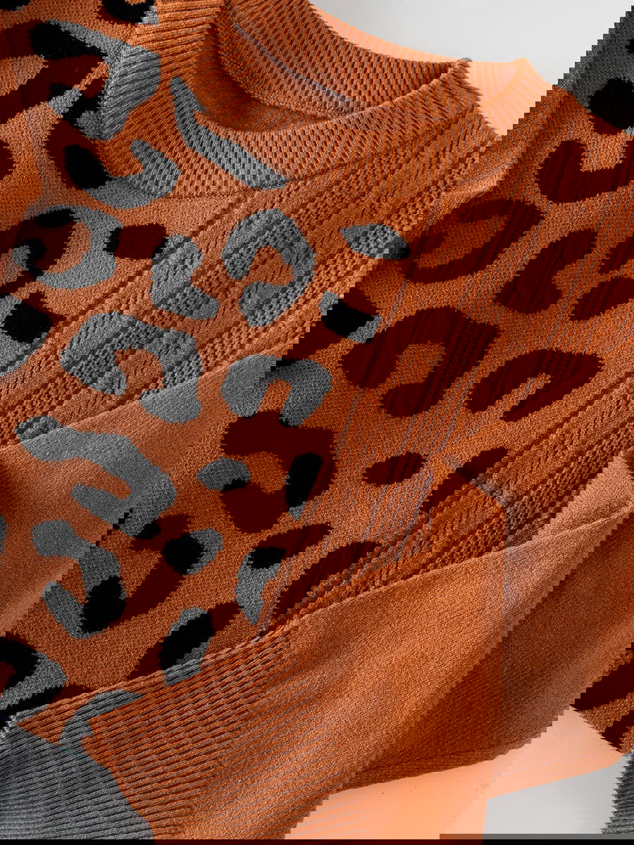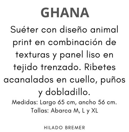 Suéter con diseño animal print en combinación de texturas y panel liso en tejido trenzado. Ribetes acanalados en cuello, puños y dobladillo.