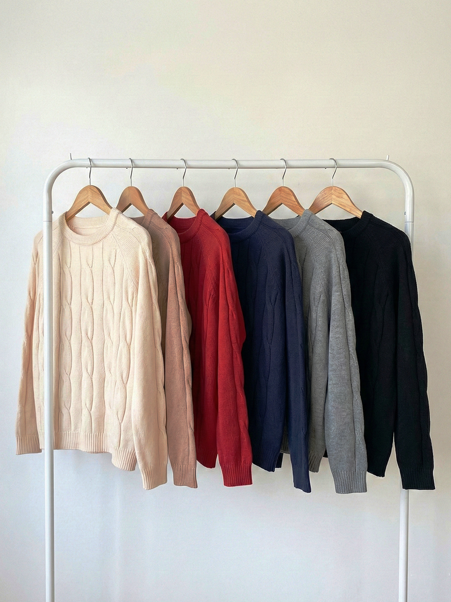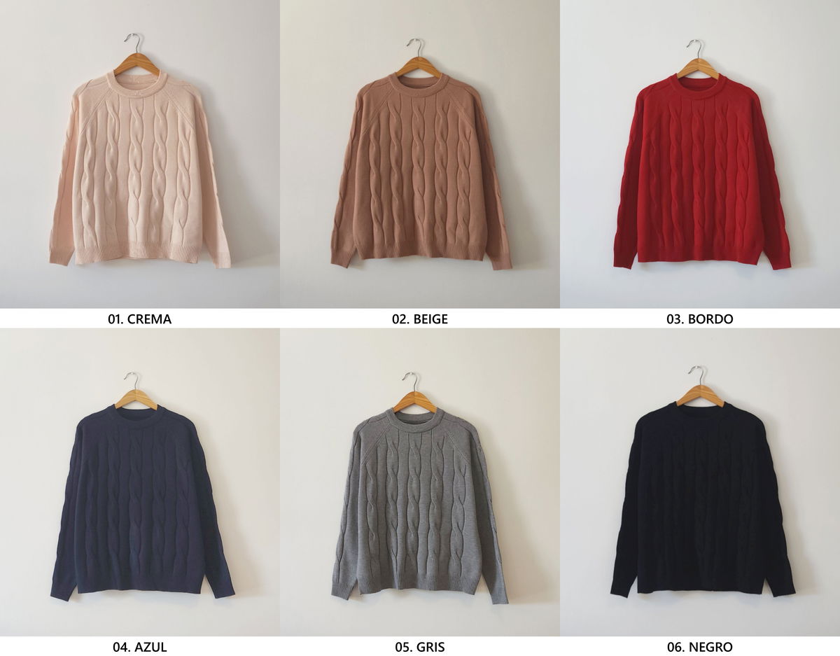 Sweater de punto con diseño de trenzas verticales en el frente.