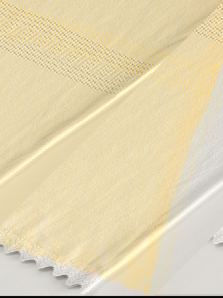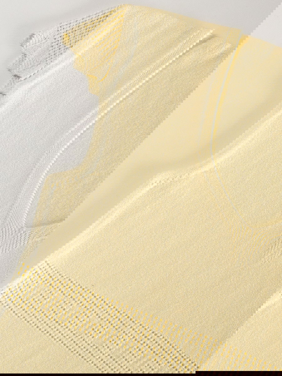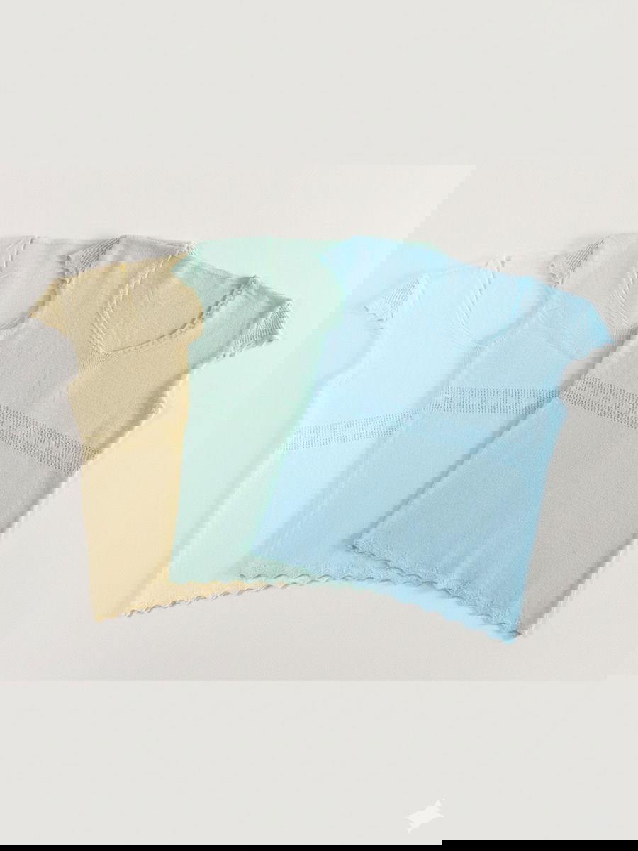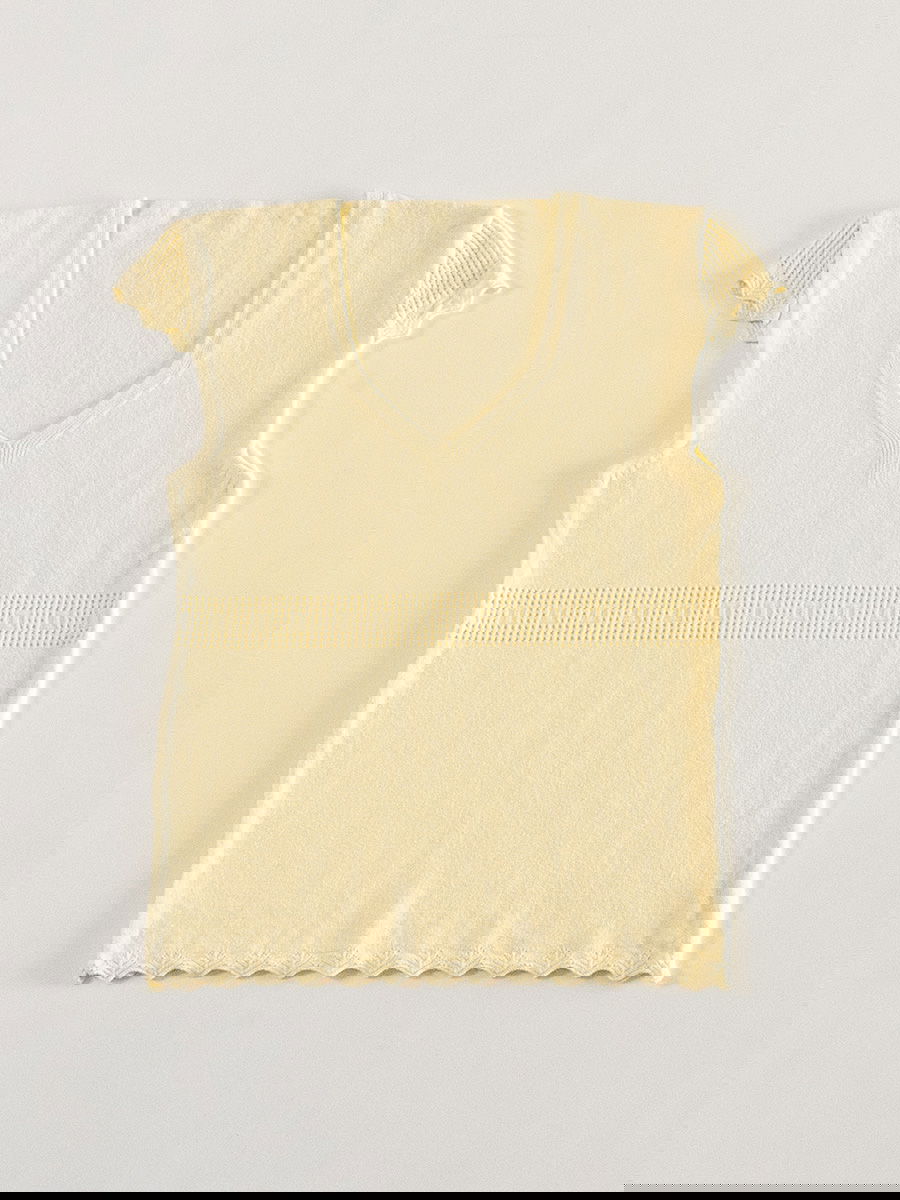 Remera tejida con escote en V, detalle calado en cintura y terminaciones onduladas.