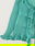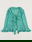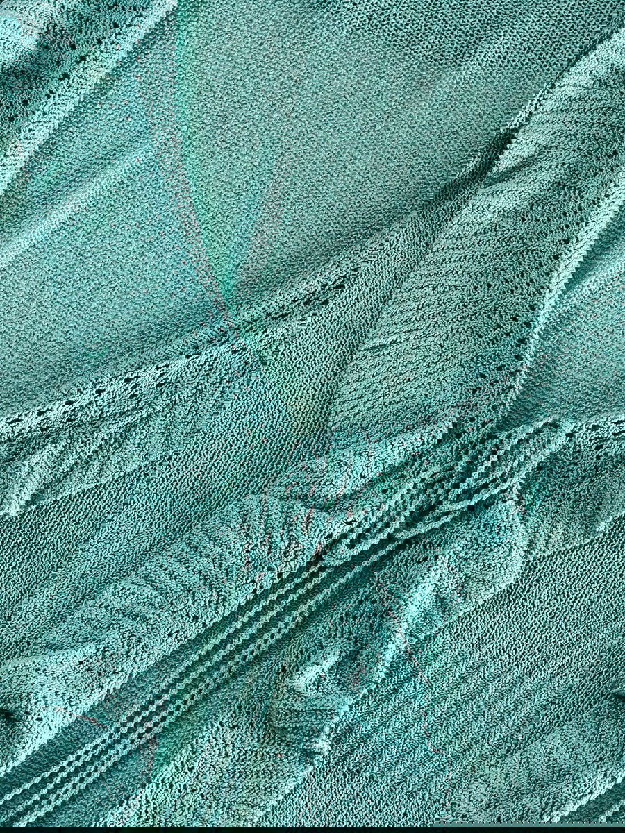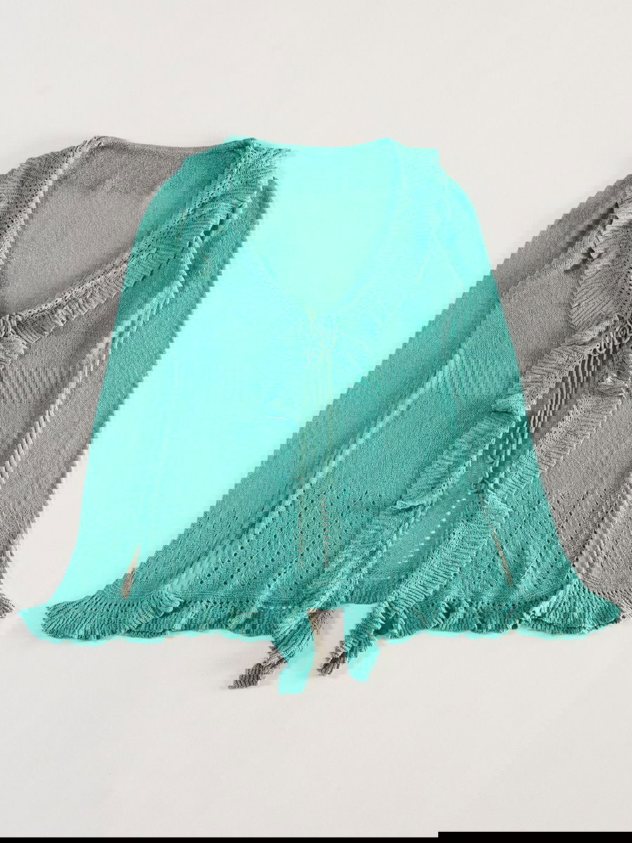 Saco tejido liviano con volados en el frente, cuello y puños. Cierre delantero con cordones tejidos. Diseño calado en la parte inferior y terminaciones acanaladas.