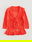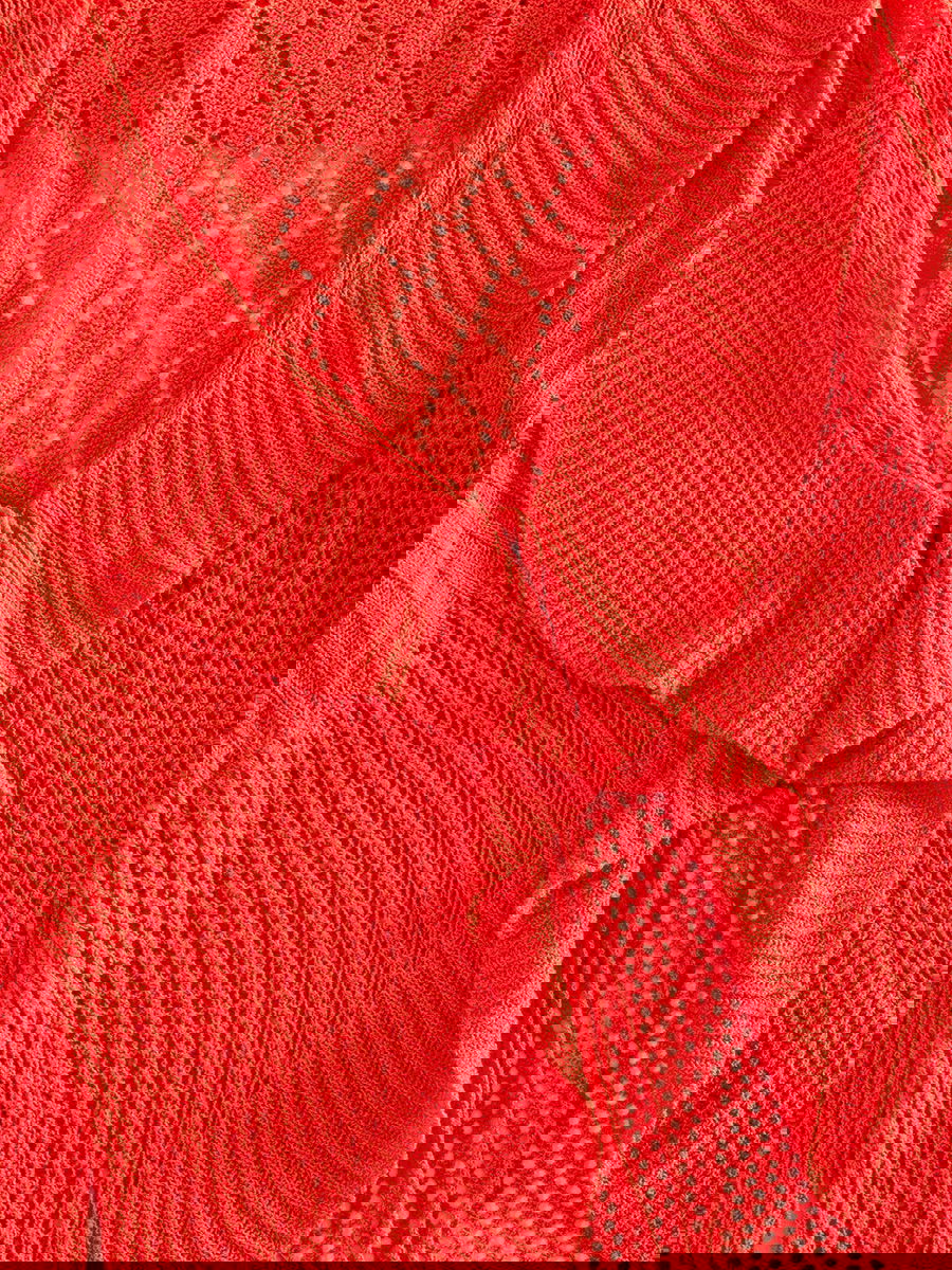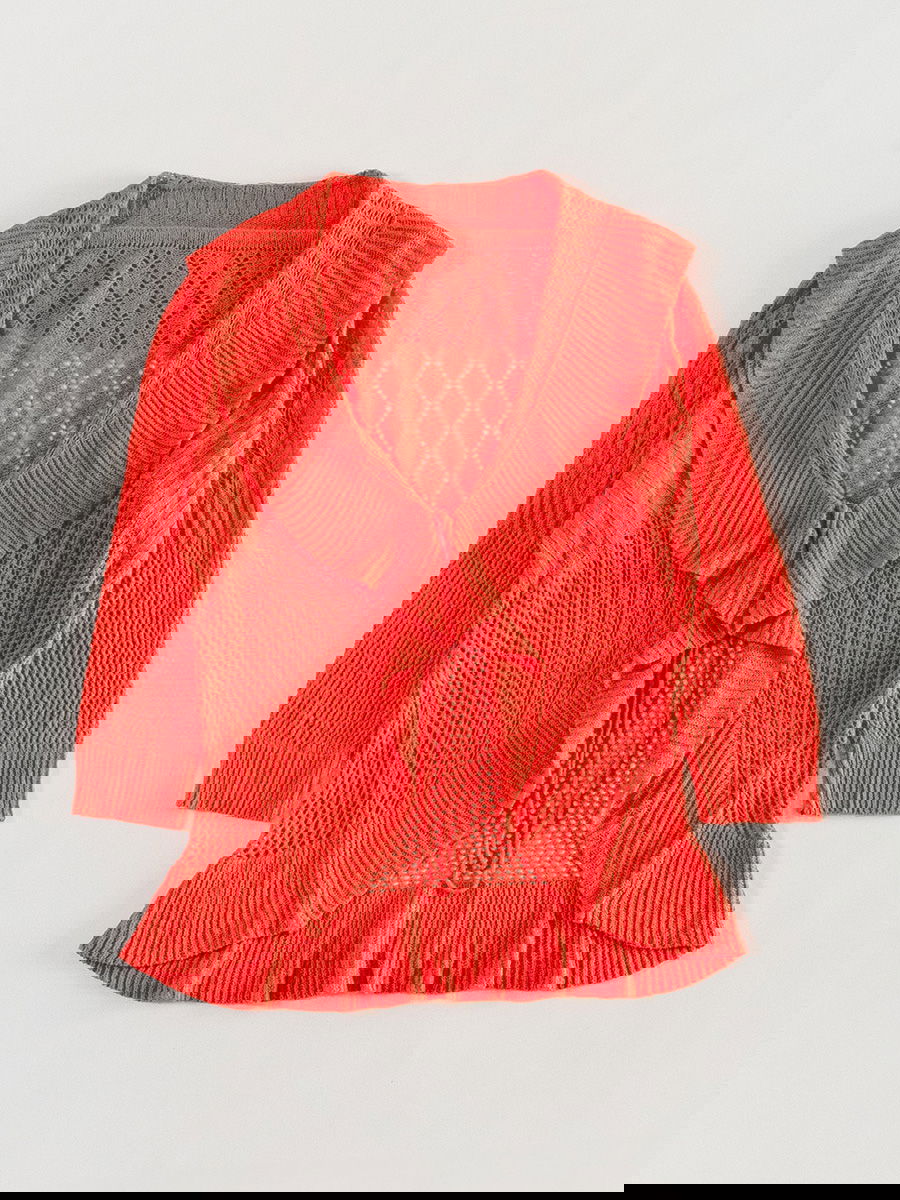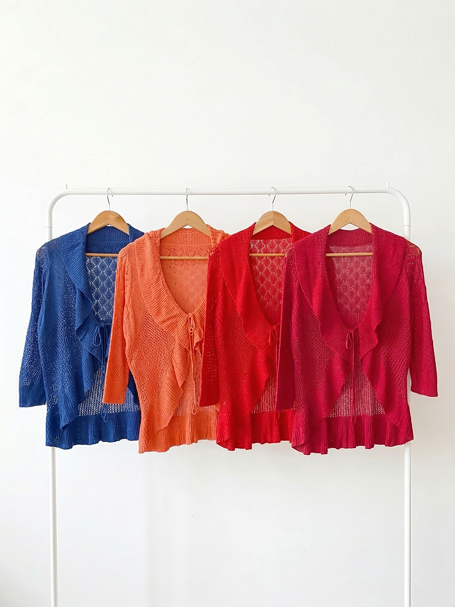 Saco tejido liviano con diseño calado en el frente y la espalda, cuello amplio acanalado y volados en la abertura frontal y el ruedo. Cierre delantero con cordones tejidos. Mangas tres cuartos con combinación de puntos calados y puños acanalados.
